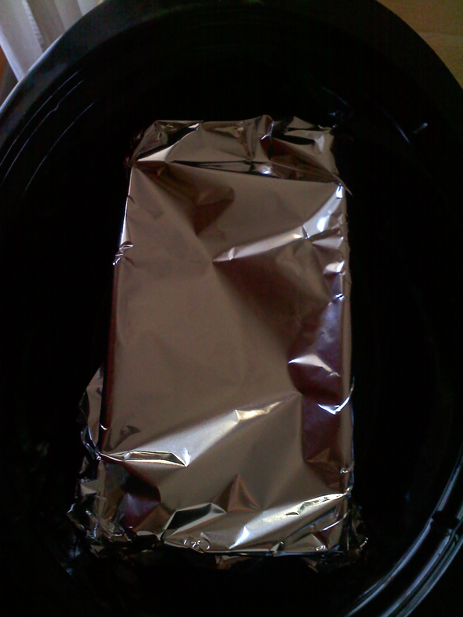 Cover with greased tin foil. Let stand for 5 minutes. Place in the slow cooker.