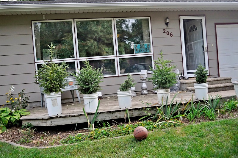 Anyways, the 5 evergreens currently stand proudly on my front deck. Their placement has risen more than a few eyebrows of friends as they have come over recently. So much so, that I began to refer to them in song as in the 12 Days of Christmas, but instead of “5 golden rings”, I belt out, “5 Evergreens”!