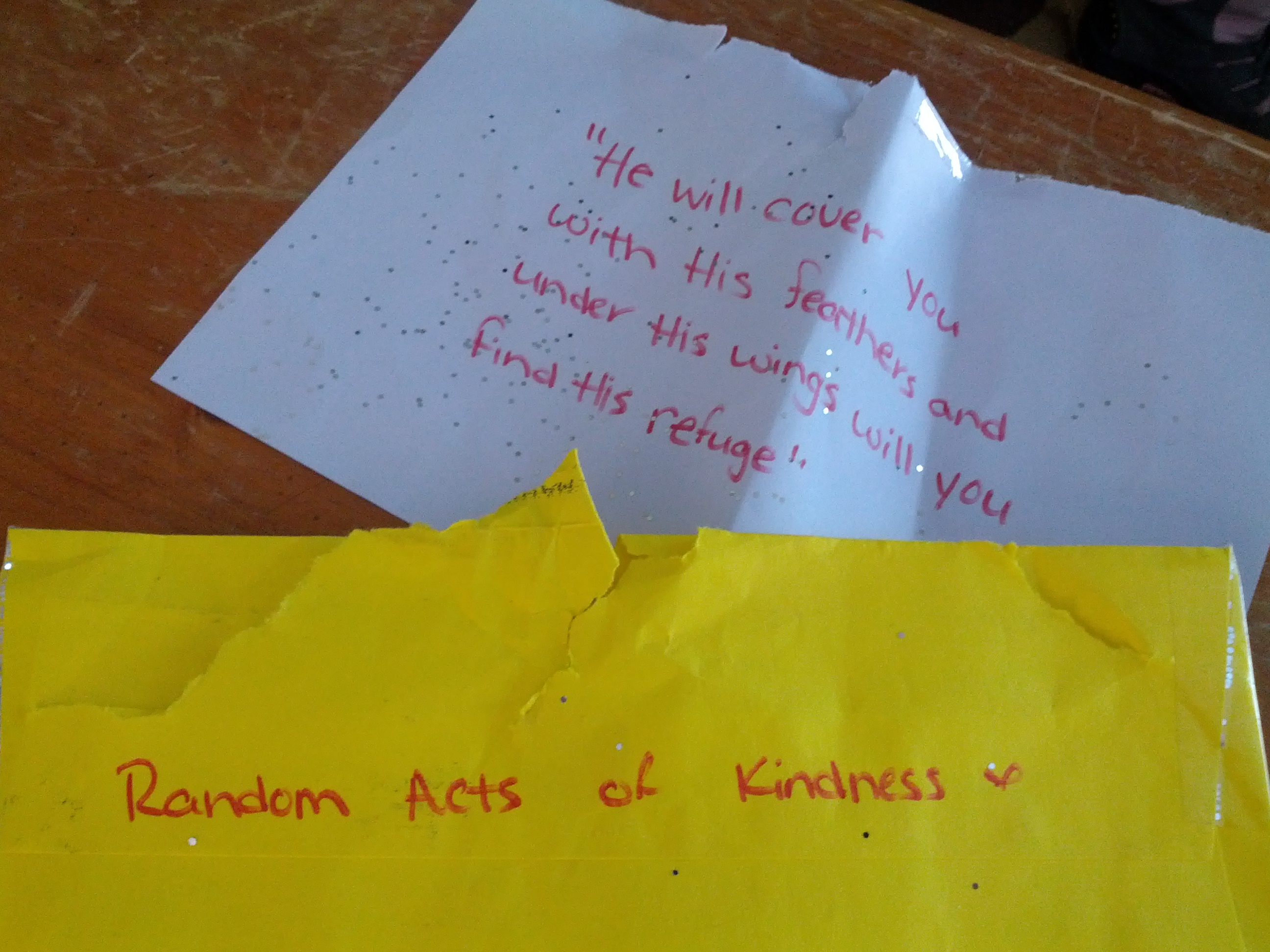 My family continues our philosophy of service by quietly completing our own 26 acts. In a strange turn of events, we were, once again, the recipients of someone’s kindness when I received a glitter-filled handwritten Bible verse from an anonymous encourager. It made my day! While I have been thinking of others, someone was thinking of us.