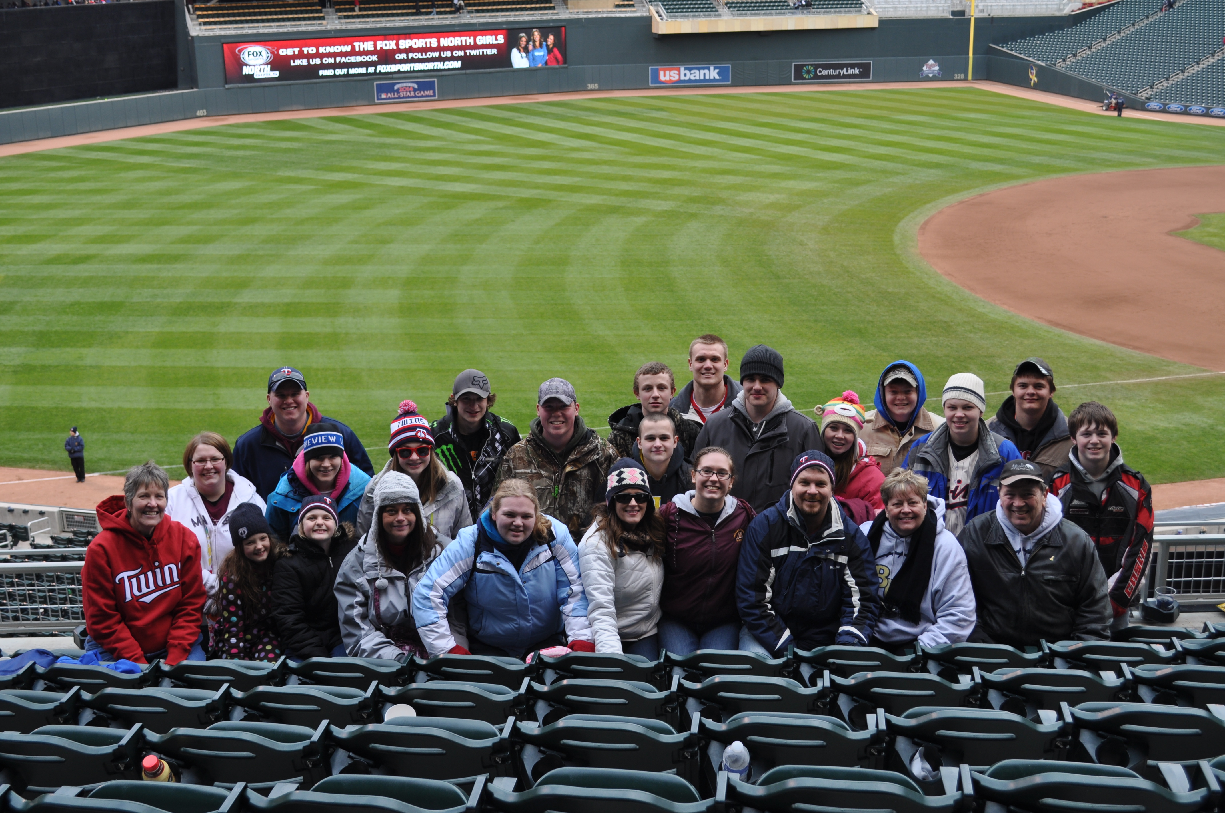 The trip up was amazing, filled with swapped stories – a family reunion of sorts on wheels. After a fun trip on the light rail, we arrived at the Twins stadium – all twenty-five of us. We had great seats – which fortunately turned out to be right next to the built-in heaters. Just in case, we were bundled from head to toe, looking like the little brother in The Christmas Story movie.