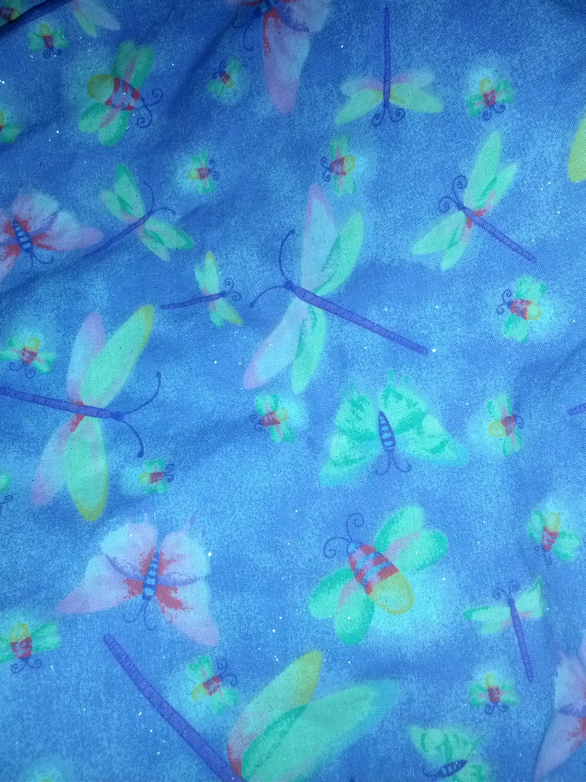 Next off the whole works went to my friend with a long arm business for the actual quilting. She had a design which included butterflies, ladybugs, flowers, dragonflies, and hummingbirds. Darling!