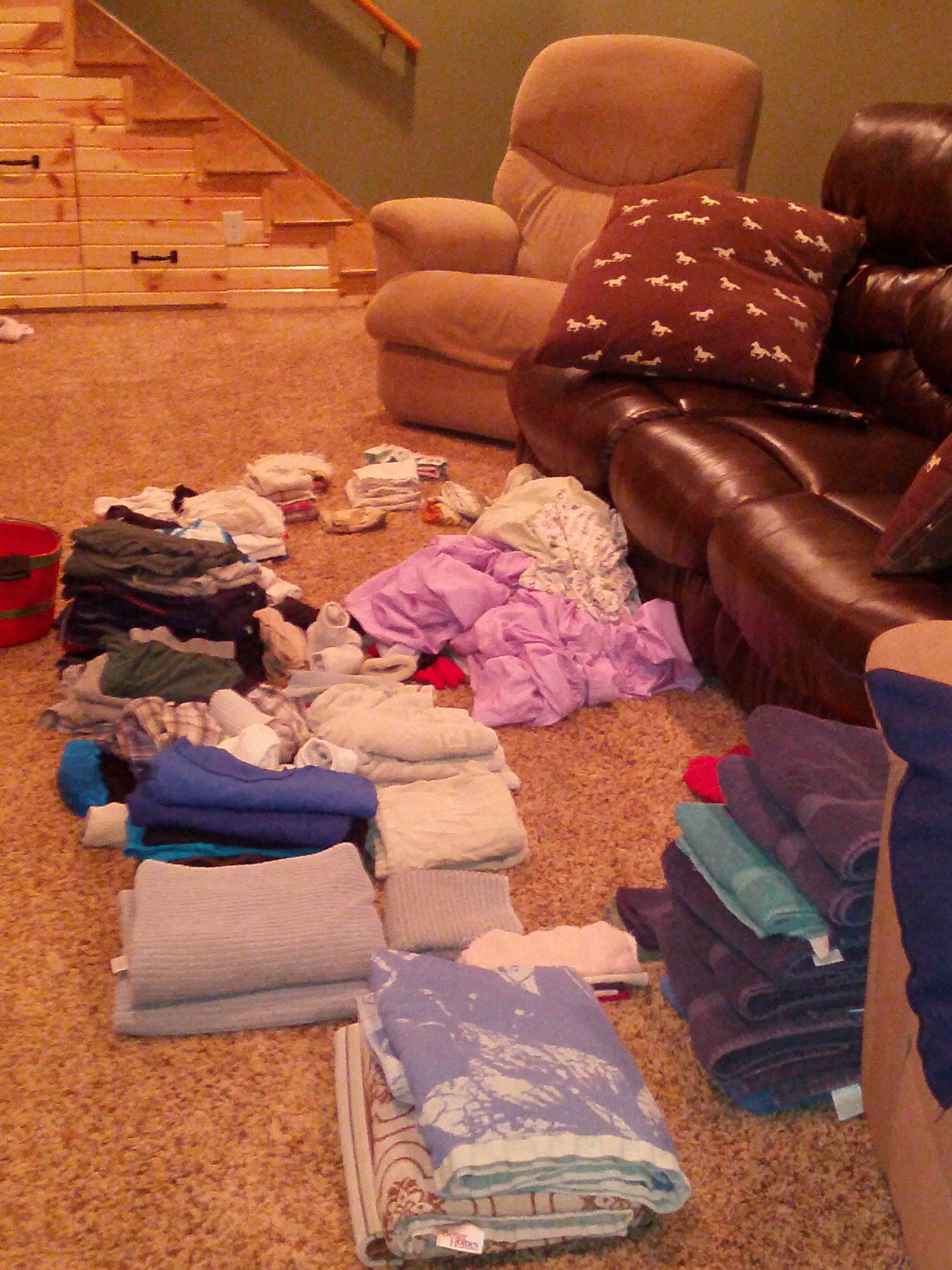 Notice the beautifully folded and stacked clothes and towels. Did you also notice the wadded up pile of bed sheets. I decided to use this as a teachable moment. What follows next is the true conversation:
