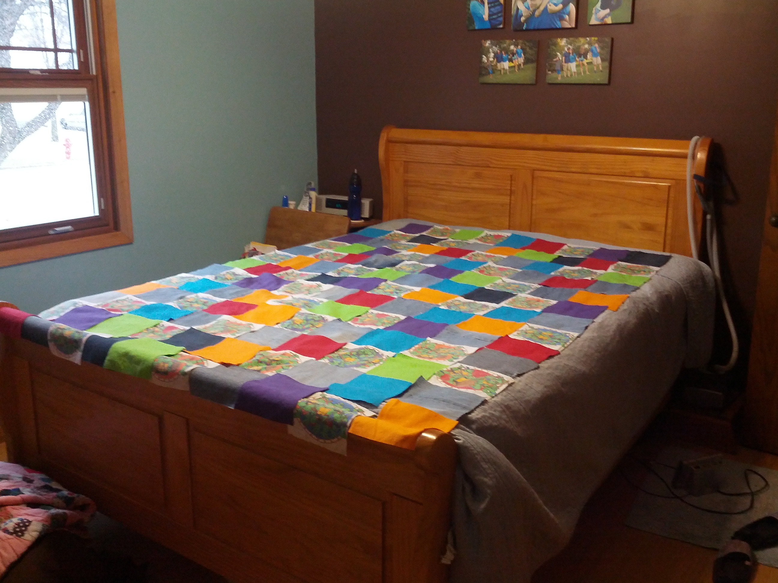 Words do not adequately express how thrilled I was when I got the flannel fitted sheet, but I will confess to being more than a little nervous. This worn flannel was a precious part of his childhood. I had a hard time cutting it into quilt squares. Once I finally mustered the courage, there was no turning back. I wanted the quilt to be cuddle sized for each recipient, and I wanted a simple design that exuded all things cartoon turtle. It didn’t take long to choose a fleece blanket backing with flannel squares in orange (for Mikey), red (for Raph), blue (for Leo), purple (for Donnie), and turtle green. The only difference between daddy’s and daughter’s quilts would be the addition of some denim squares in the larger quilt and a different sized quilt blocks due to the nature of the repeating pattern of the original sheet.