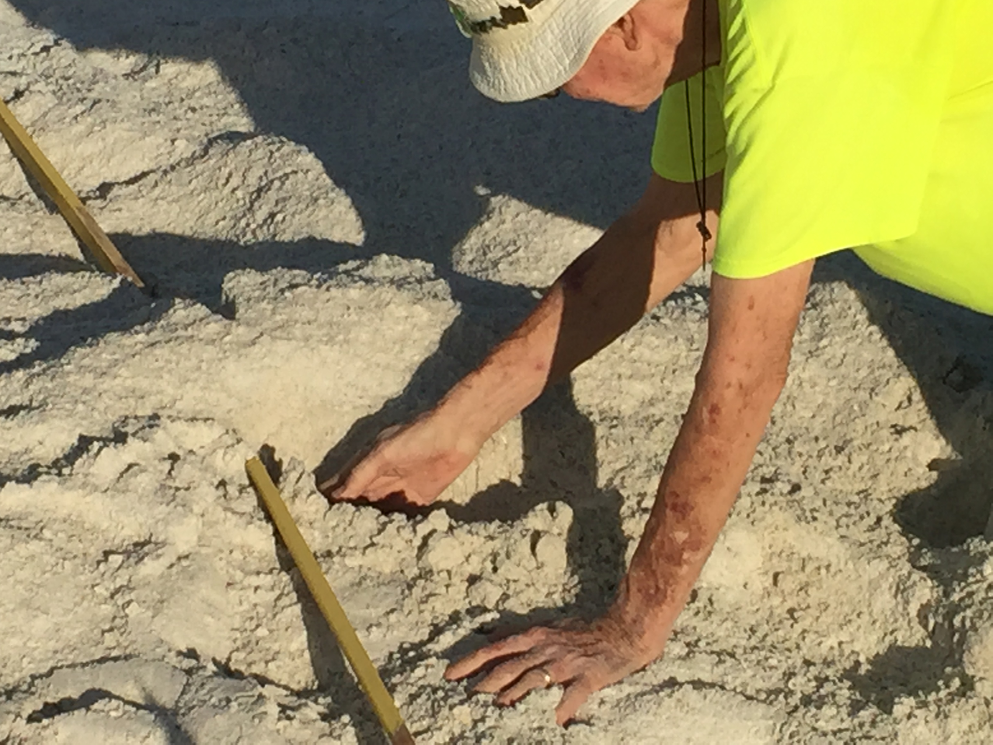 We got on our beach clothes and started our trek to the beach – always a good investment in my soul. Truth be known, I wasn’t ready to say good-bye to the beautiful water and its enticing siren call. Within moments of our arrival, we noticed our last minute wishing was about to pay off. The distinct tracks in the sand led to a pit closer to the native grasses. A quick scan of the beach told us, the trained “officials” had already walked their sector and they were waiting for back-up to properly locate and cordon off the nest. As a science teacher and a LOVER of God’s amazing creation I was downright giddy. This was one of the coolest things ever! A quick call to the beach house roused all the other nature lovers in our clan.