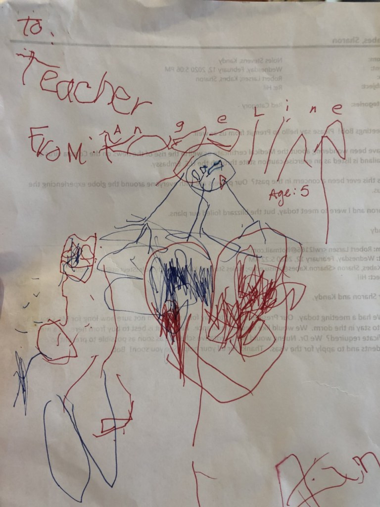 And so, it was, one day last year prior to the pandemic really reaching the Midwest. The first publicized case in Minnesota wouldn’t be for another month. I volunteered to be a driver for a friend who needed to have a surgical procedure in the cities. While she was in surgery, I caught up on grading (not one of my superpowers for the record) and watched as families came and went as other procedures began. One family had a little girl who was waiting so patiently in the beginning to have her arm reset after breaking it. It was clear that as time wore on, she used up her goodness and mercy and was becoming really antsy. Her parents were trying everything to keep her occupied, not with much success. As any superhero educator would do, I had my Mary Poppins-esque teacher bag along. I pulled out some printed pages I no longer needed and a few colored pens. I explained to her parents that I am a teacher, indicating I was a safe person, and wondered if the little girl could still draw with one hand. Just as I gave the sweet little girl the make-do entertainment, I was called back to the recovery room to get the instructions to care for my friend, and I thought I would never see her again.