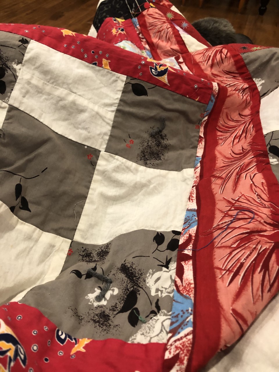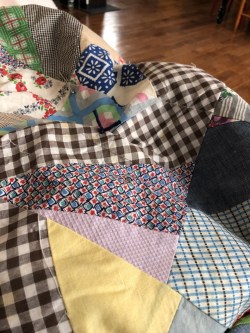 When we got home, the busyness of life filled our days and those quilt tops were packed in the back of a closet at my house. Apparently, the apple didn’t fall far from the tree as those beautiful heirlooms (based on the paper piecing on the back some of the newspapers dated to the 1960s) went from closet to closet. That is until, I decided to be intentional in preparing for the quiet and reflective moments of winter. As the leaves started to turn, I pulled those old tops out, bought some batting, and fabric for the backs. I spent weeks tying the quilts as they were never really meant for machine quilting, and then completed the binding, using the backs as the borders. With each one, I thought of the connections through time and love that those pieces of fabric brought to me.